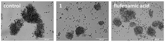 Three-dimensional cell cultures offer a more relevant model for assessing OSC potency and translation potential than monolayer cultures. U2OS-MTX cells grown in serum-free, low-attachment conditions form osteospheres (also called sarcospheres) which are an irregular collection of OSCs with naturalistic properties. The addition of 1 (at its corresponding IC20 value for 10 days) to single cell suspensions of U2OS-MTX cells markedly disrupted the formation of osteospheres compared to untreated control cells (Figure 3). Flufenamic acid also inhibited the formation of osteospheres but to a lesser extent than 1 (at its corresponding IC20 value upon 10 days incubation) (Figure 3). Under identical conditions, cisplatin and carboplatin (at their corresponding IC20 value) did not noticeably affect osteosphere formation, whereas salinomycin (at its corresponding IC20 value) did inhibit osteosphere formation but to a lesser degree than 1 [31]. Having shown that 1 is able to disrupt osteosphere formation, the colorimetric resazurin-based reagent, TOX8 was used to determine the effect of 1 on osteosphere viability. Interpolation of dose-response curves showed that 1 displayed low micromolar toxicity towards osteospheres (Table 1, Figure S7). Based on the IC50 values, 1 was 9.1-fold more potent towards three-dimensionally cultured osteospheres than U2OS-MTX cells grown in monolayer cultures. This is a remarkable result given that most small molecules exhibit lower potency towards spheroidal systems compared to monolayer systems (made up of the same cells). This trend was also evident for flufenamic acid, which was non-toxic towards U2OS-MTX cells grown in monolayer cultures but displayed micromolar potency towards osteospheres (IC50 = 13.17 ± 0.24 µM, Figure S7). This suggests that the flufenamic acid moiety may play a role in the osteosphere potency observed for 1. Furthermore, 1 displayed significantly higher potency towards osteospheres than cisplatin, carboplatin, and salinomycin (up to 7.7-fold, p < 0.05) [30].