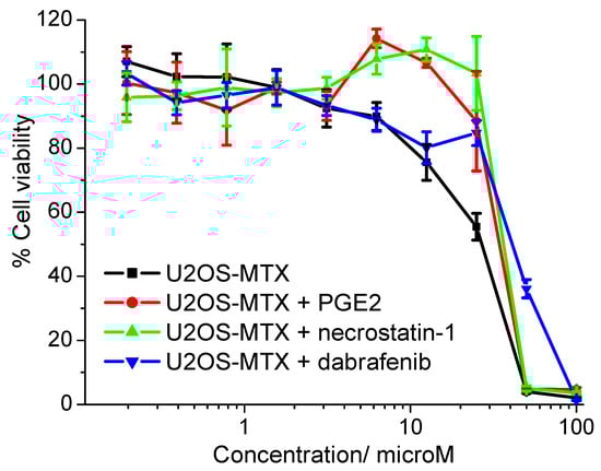 Representative dose-response curves for the treatment of U2OS-MTX cells with 1 in the absence and presence of PGE2 (20 µM), necrostatin-1 (20 µM), or dabrafenib (10 µM) after 72 h incubation.