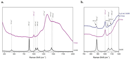 The most prominent peak of urine was observed at 1003 cm−1 (Figure 1a), which is attributed to the symmetric C–N stretching of urea [46]. Although for solid urea the symmetric C–N stretching vibration is detected at 1010 cm−1, in solution it is shifted to lower wavenumbers [47]. Concerning ethanol, the most intense peak at 883 cm−1 is due to the symmetric stretching of the C–C bond. The Raman spectrum of ethanol is also characterized by less intense peaks at 434 cm−1 (bending vibration of C–C–O), 1053 cm−1 (asymmetric stretching of the C–O bond), 1096 cm−1 (rock vibrations of CH3), 1277 cm−1 (torsion and rotational vibrations of CH2), 1455 cm−1 (bending vibrations of CH3 and CH2), and 1482 cm−1 (bending vibrations of CH3) (Figure 1a) [48].