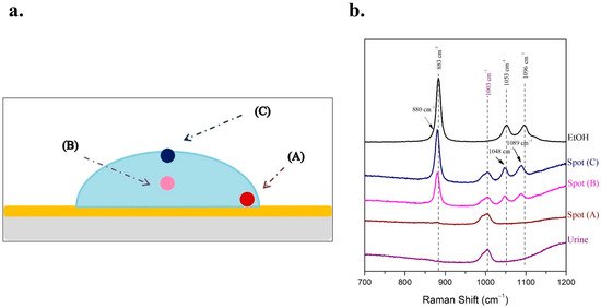 The characteristic peak of urine at 1003 cm−1 was easily detectable in all three Raman spectra. However, significant variations of the intensity of the most prominent peak of ethanol at 880 cm−1 were observed depending on the spot of the droplet on which the Raman laser beam was focused. More specifically, the peak of ethanol was barely distinguished from noise level in the Raman spectrum of the droplet’s spot (A), while the intensity of the ethanol peak is the maximum possible in the Raman spectrum of the spot (C) (Figure 2b). Thus, the spot (C) of the droplet is the optimum position to focus when the Raman spectrum is acquired, as the ratio of the peak intensities (ethanol to urine) is maximum. This is the outcome of the non-uniformity of ethanol concentration inside the droplet and can be attributed to mass and thermal convection phenomena [50]. Higher evaporation flux near the contact line leads to minimal ethanol concentration at the edge of the droplet (spot A). On the contrary, many ethanol molecules are trapped in the center near the top of the droplet where concentration is maximized [50].
