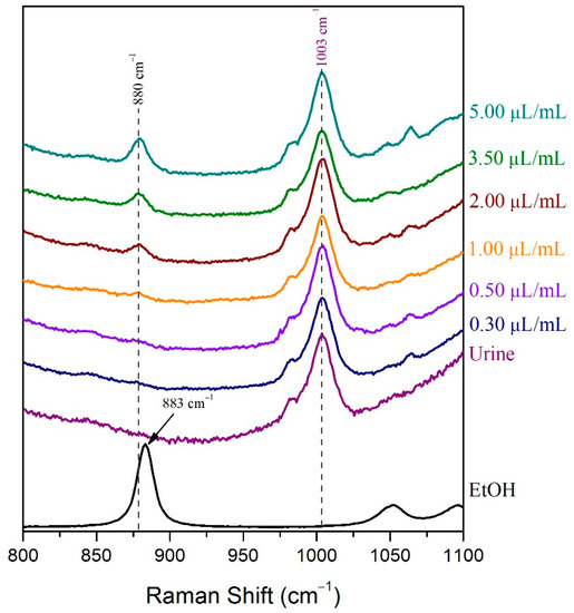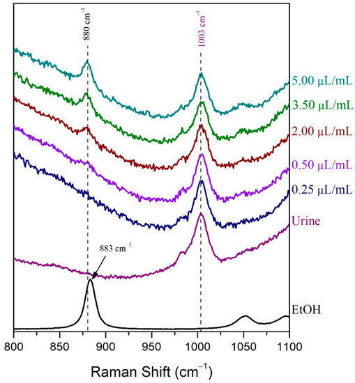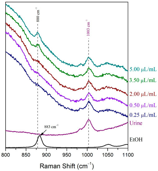 In the Raman spectrum of the 5 μL/mL ethanolic sample in human urine, the peak of urea at 1003 cm−1 was clearly detected, as well as the most prominent peak of ethanol. However, the peak of ethanol, which is attributed to the symmetric stretching of the C–C bond, was shifted to 880 cm−1 from the initial 883 cm−1. Similarly, the peaks of ethanol at 1053 cm−1 and 1096 cm−1 were shifted to 1048 cm−1 and 1089 cm−1, respectively (Figure 1b). These slight shifts to lower wavenumbers can be explained by the intermolecular interactions of ethanol and water. The molecules of water form a three-dimensional grid of hydrogen bonds among the hydroxylic groups. However, the addition of ethanol in concentrations up to 15–20% w/w leads to a structural rearrangement of the hydrogen bond network, as one molecule of ethanol is inserted for every five molecules of water. In this case, the hydrogen bonds are stronger than in water, resulting in weakening of the neighboring C–C and C–H bonds [49]. This is due to charge transfer leading to significant changes in the polarizability of the bonds. This change in polarizability is depicted in the Raman spectrum as a red shift, i.e., the peaks corresponding to the vibrations of the specific bonds are shifted to lower wavenumbers [48,49].