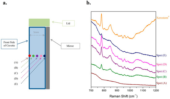 The method of the commercially available cuvette was applied on a liquid sample of Xerostom®. (a) Schematic illustration of the focus on five different spots of the cuvette; (b) the respective Raman spectra of Xerostom® from the five different focuses on the cuvette were recorded.