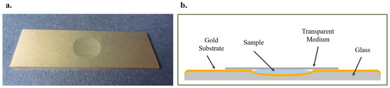 (a) The microscope slide with the cavity in the center of the slide coated with gold was used for recording the Raman spectra of volatile compounds in biological fluids; (b) schematic illustration of the glass microscope slide with the cavity coated with gold and covering the sample in the cavity with a transparent medium.