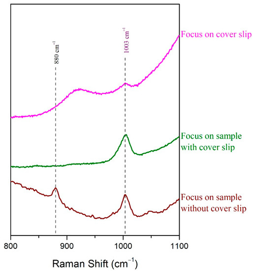 The first transparent medium tested for covering the sample was the microscope cover slip. A sample of 5 μL/mL ethanol in human urine was deposited in the cavity of the slide and covered with the glass cover slip. The laser was focused on the cover slip, and a Raman spectrum was collected which appeared identical to the one acquired when a sample’s droplet was caged between the gold coated glass slide and the cover slip. The peak of urine at 1003 cm−1 was barely detected, whereas no characteristic peak of ethanol could be observed (Figure 7). When the laser was focused in the main volume of the sample (under the cover slip), the peak of urea at 1003 cm−1 was clearly detectable; however, the most prominent peak of alcohol at 880 cm−1 could not be observed (Figure 7). Last, the cover was removed, and the spectrum of the sample was recorded. Both peaks of the urine at 1003 cm−1 and ethanol at 880 cm−1 were clearly detected (Figure 7). It can be, thus, concluded that the glass microscope cover slip may protect the sample from evaporation, but no clear signal from the sample is collected. The minor constituent is not detected.