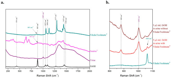 The material of cling films is crucial. It varies among the different suppliers as well. Two different cling films were tested; the first one was a 0.006 mm thick poly(vinyl chloride-vinyl acetate-vinyl alcohol) transparent membrane (Sanitas®), while the second one was a 0.006 mm thick polyethylene low-density transparent cling film (Vileda Freshmate®). The Raman spectra of the two membranes were recorded and found to differ significantly. In the spectrum of the Sanitas® transparent membrane only a few peaks were observed, none of them in the area between 880 cm−1 and 1003 cm−1. However, multiple humps were observed; a broad significant hump was indeed observed at 883 cm−1, which interferes with the peak of ethanol (Figure 8a). On the contrary, in the Vileda Freshmate® film’s Raman spectrum a few intense peaks appeared in the spectral area 1060–1500 cm−1. None of them would interfere with peaks of ethanol and urine at 883 cm−1 and 1003 cm−1, while only a broad peak of very low intensity was observed at 883 cm−1 (Figure 8a).