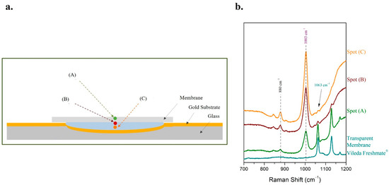 The effect of Vileda Freshmate® cling film’s small broad peak at 883 cm−1 on the detection of the ethanol peak at the same Raman shift was further investigated. A sample of 5 μL/mL ethanol in human urine filled the cavity, and a piece of the membrane covered it, carefully taking care to be completely in touch with the sample so that no air is trapped in between. Except for the cavity, the membrane covered a surface of the gold-coated glass slide around the cavity in order to prevent leaking of the liquid sample out of the well. The Raman spectrum of the sample was recorded before and after covering with the transparent membrane. Both peaks of urine at 1003 cm−1 and ethanol at 880 cm−1 were clearly detectable, while the extra peaks of the membrane did not affect the determination of either the alcohol or the biological fluid (Figure 8b). The peaks of urine and ethanol were as distinct as in the Raman spectrum of the sample recorded without the transparent membrane despite the presence of an additional small peak at 1063 cm−1 corresponding to the membrane (Figure 8b). No interference from the small and broad peak of the transparent membrane at 883 cm−1 was detected in the Raman spectrum of the sample, which was covered with the membrane (Figure 8b). Therefore, the Vileda Freshmate® cling film was selected as the most appropriate transparent coating of the cavity.