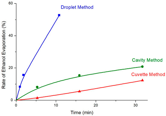 Rate of ethanol evaporation as a function of time for the method of droplet, the method of cuvette, and the method of the gold-coated glass slide with cavity.