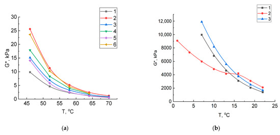 Dependences of the complex shear modulus of samples on a temperature: (a) vacuum residue: 1—original, 2—after aging in RTFO; vacuum residue oxidation product with crumb rubber: 3—original, 4—after aging in RTFO; vacuum residue oxidation product: 5—original, 6—after aging in RTFO; (b) after aging in PAV: 1—vacuum residue, 2—vacuum residue oxidation product, 3—vacuum residue oxidation product with crumb rubber.