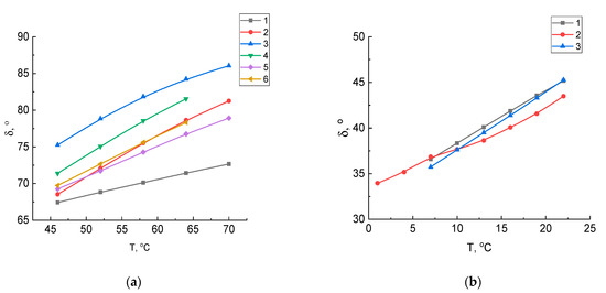 Bitumen viscoelastic behavior can be described by a phase angle δ (tan δ = G”/G’); the smaller the phase angle, the greater the elasticity and the less the plasticity. Figure 2 shows variations in the phase angle δ of samples depending on the temperature and type of aging. As can be seen from the figure, when the temperature increases, the phase angle increases. In the initial state, the vacuum residue oxidation products have a phase angle higher than the vacuum residue itself. With short-term aging in the temperature range from 46 to 70 °C, the phase angle of the vacuum residue oxidation product without a modifier decreases by 4–5 °C. The vacuum residue oxidation product also has the relatively low values of the phase angle during long-term aging. As noted above, the more elastic bitumen has a low phase angle value. Research studies [16,17] found that at high temperatures, both short-term and long-term aging increase the complex shear modulus and reduce the phase angle of bitumen.