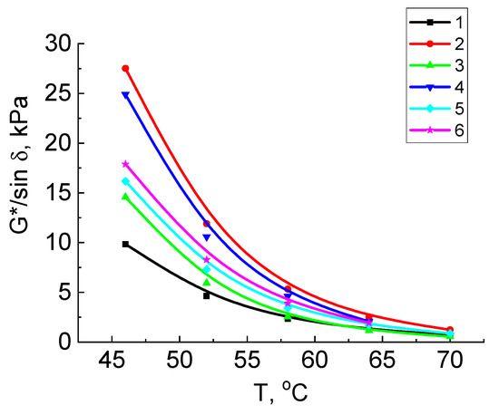 Figure 3 and Figure 4 show the dependencies of G*/sin δ and G*⋅sin δ parameters on temperature to determine the maximum and average design temperatures of vacuum residue and its oxidation products without and with addition of the crumb rubber for original and aged samples in RTFO and PAV. Among the original samples, a vacuum residue oxidation product with crumb rubber has the largest rut parameter, respectively, highlighting its resistance to rut formation. A comparison of the dependencies for the rut parameter for the original and aged samples showed that the magnitude of the parameter for samples subjected to the short-term aging process increased when compared to the original samples. This confirms the fact that, during the aging of bitumen, it becomes stiffer and, accordingly, less subjected to plastic strain.