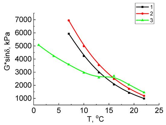 Dependences of fatigue parameter G*sin δ for samples aged in PAV on a temperature: 1—vacuum residue, 2—vacuum residue oxidation product with crumb rubber, 3—vacuum residue oxidation product.