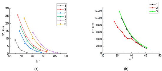 “Black diagrams”: (a) vacuum residue samples: 1—original, 2—aged in RTFO; vacuum residue oxidation product: 3—original, 4—aged in RTFO; vacuum residue oxidation product with crumb rubber: 5—original, 6—aged in RTFO; (b) after aging in PAV: 1—vacuum residue, 2—vacuum residue oxidation product, 3—vacuum residue oxidation product with crumb rubber.
