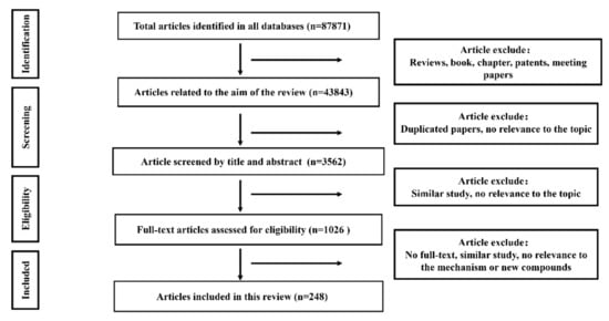 The flowchart of the literature search and selection of this review is shown in Figure 1. Overall, 87,871 studies were identified. Then, 44,028 records were removed for the following reasons: reviews, book chapters, letters, news, patents, meeting papers, reports, etc. Duplicated papers and records that are not relevant to the topic were excluded after the database screening, and 3562 studies were identified. By screening the titles and abstracts, 2536 records were excluded because they were similar and had no relevance to the scope of this review. Then, the full text of 1026 papers was reviewed and assessed to check if they were eligible for this scoping review. As a result, 248 studies were included in this review.