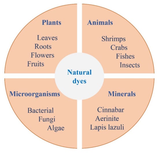 Natural dyes can be extracted from plants, animals, microorganisms, minerals, and some other materials (Figure 2).