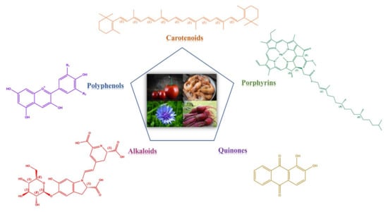 Natural dyes can be divided into the major categories by chemical structure. They mainly include carotenoids, polyphenols, porphyrins, alkaloids, and quinones (Figure 3).