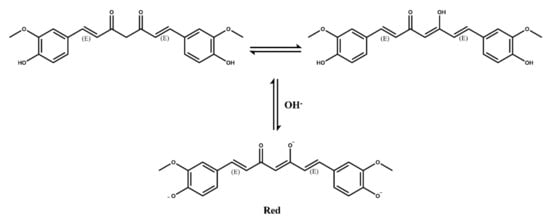 Curcumin is a polyphenolic compound extracted from Curcuma longa L., which has been generally recognized as safe []. Curcumin has also been approved by the FDA as a natural food additive. Curcumin can be used as an acid–base indicator because it changes from yellow to red at pH greater than 8 (Figure 6). Anthocyanin and curcumin are the main phenolic natural dyes and promising natural dyes because they have been shown to have many health benefits. Curcumin also plays a potential role in intelligent packaging [].