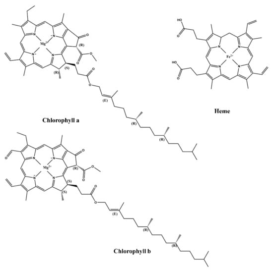 Molecular structures of heme, chlorophyll a, and chlorophyll b.