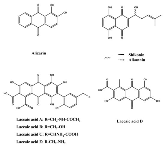 Alkannin and its enantiomer shikonin are valuable natural dyes found in purple-colored roots of red gromwell (Lithospermum erythrorhizon) []. Recently, shikonins/alkannins have been discovered to exhibit a range of pharmacological properties and could be used as drug scaffolds to design a set of derivatives [], which has excellent prospects in drug development. Furthermore, the components of lac dyes laccaic acid A, laccaic acid B, laccaic acid C, laccaic acid D, and laccaic acid E are also quinone dyes (Figure 9). In the last decade, marine resources and microorganism resources were the main sources of new quinone dyes, which suggested new directions and strategies for developing natural dyes. However, the toxicity and pharmacological activities of these new natural dyes need to be further studied so that they can be applied in the market.