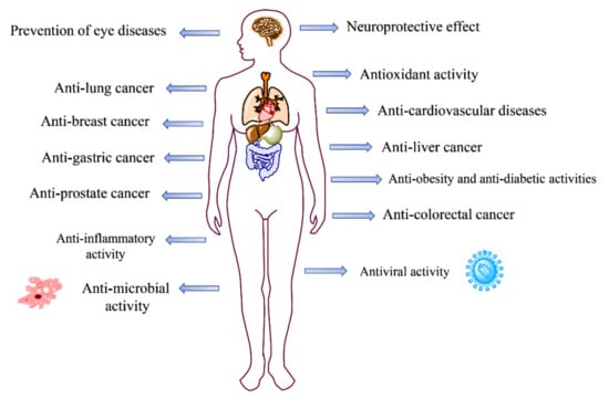 The pharmacological activities and related mechanisms of natural dyes have been studied extensively. The health benefits of carotenoids, anthocyanins, curcumins, and betalains were mainly discussed in recent years, including antioxidant activity, anti-inflammatory activity, anti-cancer activity, anti-cardiovascular disease activity, anti-obesity and anti-diabetic activity, anti-microbial activity, anti-viral activity, and neuroprotective effect (Figure 10).