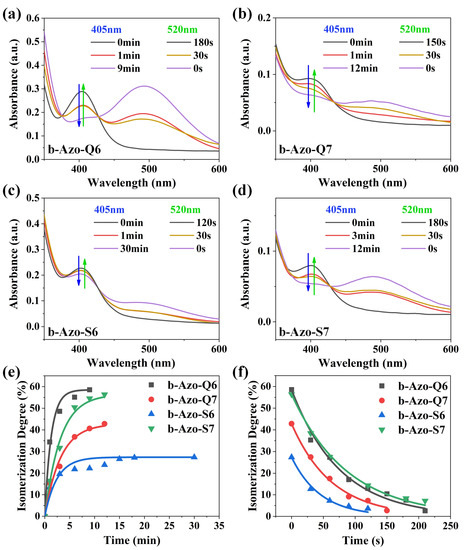 Nuclear magnetic resonance was used to study the isomerization behavior of the b-Azo chromophores under blue light irradiation, the chemical shifts of which will change due to the different configurations of the Z and E isomers [27]. The degree of isomerization can be calculated from the peak integration (Figures S6–S17, Supplementary Materials). It can be calculated that the maximum degrees of isomerization of b-Azo-Q6, b-Azo-Q7, b-Azo-S6 and b-Azo-S7 are 58.5%, 42.8%, 27.4% and 56.4%, respectively. It should be noted that the configurations of these compounds are inherently distorted, and coupled with the effect of rigid alkyne substitution, small changes in the length and volume of the molecular chain have a significant impact on intermolecular forces, steric hindrance, planarity and so on [17,28]. It can be seen that b-Azo-Q6 has the highest degree of isomerization, a reason may be that it has the shortest chain length and thus the smallest resistance to molecular motion. In contrast, b-Azo-S6 has a low degree of isomerization, which is perhaps due to the larger resistance caused by the isopropyl group. Another reason is the poor planarity of the E isomer which weakens the intermolecular forces and makes the isomer less stable. In the case of b-Azo-S7, the longer molecular chain improves the planarity of the E isomer to a certain extent, thus increasing the stability of the isomer [28,29].