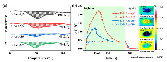 The exothermic processes of the four b-Azo chromophores were monitored by differential scanning calorimetry after being charged by blue light irradiation, as shown in Figure 3a. From these experiments, the enthalpies of isomerization (ΔHiso) of the four b-Azo chromophores were calculated. The isomerization enthalpies are expected to mainly depend on the degree of isomerization. Among the compounds, b-Azo-Q6 has the highest degree of isomerization and the highest energy density, which can reach a value of 106.1 J·g−1.