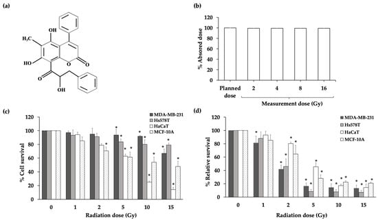 (a) The chemical structure of interruptin C compound. (b) Absorbed amount of planned dose and measured dose. Data represent the mean ± SD values from three independent experiments. The significance of the mean differences was analyzed using a paired t-test. * p < 0.05 compared to the planned dose. (c) Percentage of cell survival in the MTT assay at 72 h after irradiation of the cancer cell lines (MDA-MB-231 and Hs578T) and normal (HaCaT and MCF-10A) cell lines. Data represent the mean ± SD values from three independent experiments. The significance of the mean differences was analyzed using Kruskal–Wallis with Dunn’s test. * p < 0.05 compared to the nonirradiated cells. (d) Long-term cell survival in the clonogenic cell survival assay of irradiated cancer (MDA-MB-231 and Hs578T) and normal (HaCaT and MCF-10A) cell lines. Data represent the mean ± SD values from three independent experiments. The significance of the mean differences was analyzed using Kruskal–Wallis with Dunn’s test. * p < 0.05 compared to the nonirradiated group.