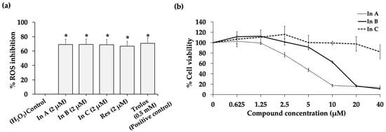 (a) Reactive oxygen species (ROS) scavenging activity was measured by the DCFH-DA assay after 2 µM In A (interruptin A), 2 µM In B (interruptin B), 2 µM In C (interruptin C), and 2 µM Res (resveratrol) compound treatments. A small amount (0.5 mM) of Trolox was used as a positive control. Data represent the mean ± SD values from three independent experiments. The significance of the mean differences was analyzed using Kruskal–Wallis with Dunn’s test. * p < 0.05 compared to the control. (b) Cell viability in the MTT assay at 72 h after treatment with In A, In B, and In C in HaCaT human keratinocytes. Data represent the mean ± SD values from three independent experiments.