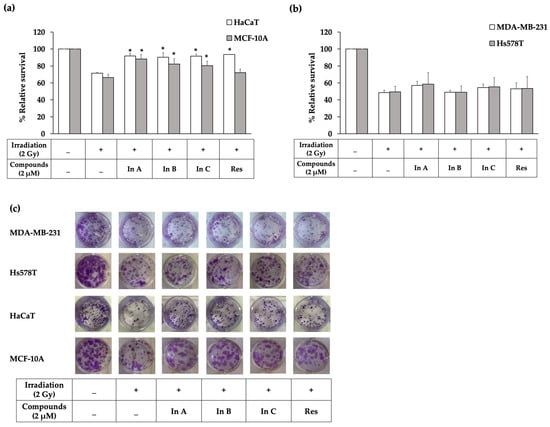 (a) Relative survival in the clonogenic cell survival assay after treatment with In A (interruptin A), In B (interruptin B), In C (interruptin C), and Res (resveratrol) in HaCaT and MCF-10A normal cells. Data represent the mean ± SD values from three independent experiments. The significance of the mean differences was analyzed using Kruskal–Wallis with Dunn’s test. * p < 0.05 compared to the irradiation-alone group. (b) Relative survival in the clonogenic cell survival assay after treatment with In A, In B, In C, and Res in HaCaT and MCF-10A normal cells. Data represent the mean ± SD values from three independent experiments. The significance of the mean differences was analyzed using Kruskal–Wallis with Dunn’s test. * p < 0.05 compared to the irradiation-alone group. (c) Images from the clonogenic cell survival assay after treatment with In A, In B, In C, and Res in MDA-MB-231 and Hs578T breast cancer cells and HaCaT keratinocyte and MCF-10A normal breast cells.