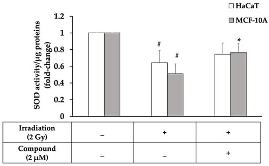 Superoxide dismutase (SOD) activity in normal cells and HaCaT and MCF-10A cell lines treated with interruptin C derived from C. terminans before 2-Gy irradiation. Data represent the mean ± SD from three independent experiments. The significance of the mean differences was analyzed using Kruskal–Wallis with Dunn’s test. * p < 0.05 compared to the irradiation-alone group. # p < 0.05 compared to the nonirradiated group.