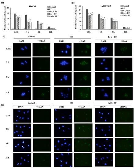(a) γH2AX assay to detect the number of γH2AX foci per cell at 0.5, 1, 3, and 24 h after irradiation. The cells were pretreated with In C (interruptin C), Res (resveratrol), and Ami (amifostine) in HaCaT and (b) MCF-10A cell lines. The cells were nonirradiated (Control), irradiated alone (RT), and treated with interruptin C before 2-Gy cell irradiation (In C+RT). Data represent the mean ± SD values from three independent experiments. The significance of the mean differences was analyzed using Kruskal–Wallis with Dunn’s test. * p < 0.05 compared to the irradiation-alone group. (c) HaCaT and (d) MCF-10A cells after irradiation in the γH2AX assay with the γH2AX foci and DAPI staining at each time point.