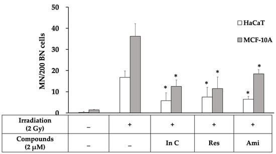 The total number of micronuclei in 200 binucleated cells from the micronuclei formation assay in HaCaT and MCF-10A cell lines treated with In C (interruptin C), Res (resveratrol), and Ami (amifostine) before 2-Gy irradiation. Data represent the mean ± SD values from three independent experiments. The significance of the mean differences was analyzed using Kruskal–Wallis with Dunn’s test. * p < 0.05 compared to the irradiation-alone group.