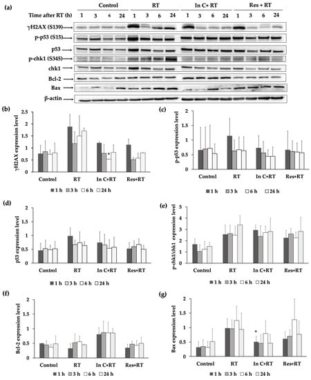 (a) Representative protein bands are shown under different conditions, including cells without irradiation (control), irradiated cells (irradiation), interruptin C treatment prior to irradiation (In C+RT), and resveratrol treatment prior to irradiation (Res+RT) at various incubation times after the irradiation exposure of HaCaT cells. The protein expression of (b) γH2AX (S139), (c) p-p53 (S15), (d) p53, (e) p-Chk1/Chk1 (S345), (f) Bcl-2, and (g) Bax was quantified. The values were normalized to β-actin intensity. Data represent the mean ± SD values from three independent experiments. The significance of the mean differences was analyzed using Kruskal–Wallis with Dunn’s test. * p < 0.05 compared to the irradiation-alone group.
