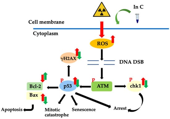 Downstream molecules and effects following DNA damage due to ionizing radiation. Reactive oxygen species (ROS) generated after irradiation can disrupt macromolecules, including DNA. This process activates ataxia–telangiectasia-mutated (ATM) and downstream molecules such as p53 and chk1. γH2AX molecules are key in the response to DNA double-stranded breaks (DSB). When cell death occurs via apoptosis, pro-apoptosis proteins are increased, and anti-apoptosis proteins are decreased. Interruptin C can protect cells from radiation by decreasing DNA damage, enhancing DNA repair, inducing anti-apoptosis proteins, and reducing pro-apoptosis proteins.