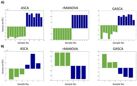 Exploration of the scores generated by the ANOVA-based methods: values of the first component. (A) TICs yeast positive. Sample colouring depending on the factor studied: green bars–extraction A: phospholipids, and blue bars—extraction B: sphingolipids; (B) Zebrafish embryos exposed to low–dose BPA. Sample colouring depending on the factor studied: green bars—control samples and blue bars—low-dose BPA treatment.
