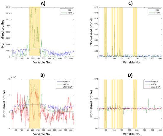 Comparison of the loadings obtained by PLS-DA variable selection methods and ANOVA-based methods. (A) TICs yeast positive PLS-DA profiles: VIP scores and selectivity ratio; (B) TICs yeast positive ANOVA–based approaches: ASCA, rMANOVA, and GASCA loadings; (C) Zebrafish embryos exposed to low–dose BPA PLS-DA profiles: VIP scores and selectivity ratio; (D) Zebrafish embryos exposed to low–dose BPA ANOVA–based approaches: ASCA, rMANOVA, and GASCA profiles. In each plot, profiles were normalized to an equal area for representation in the same scale. Shadowed boxes represent regions with a high number of relevant variables.