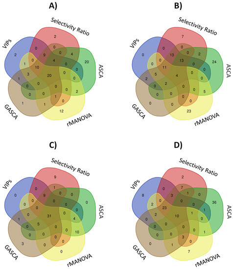 Univariate statistical tests were performed by using t-test and anova1 functions available at the MATLAB Statistics and Machine Learning Toolbox (MATLAB 2020b, The Mathworks Inc, Natick, MA, USA). Obtained p-values were adjusted by the Benjamini-Hochberg algorithm available at the FalseDiscovery library published at the github.com/carbocation/falsediscovery (accessed on 9 May 2022). ANOVA PLS-DA and ASCA were performed using PLS Toolbox 8.9.1 (Eigenvector Research Inc, Wenatchee, WA, USA), working under MATLAB 2020b. The MATLAB source code of the regularized MANOVA is available at the following github repository: github.com/JasperE/regularized-MANOVA (accessed on 9 May 2022). The GASCA algorithm is also freely available in the MATLAB MEDA toolbox and can be downloaded from the address: github.com/josecamachop/MEDA-Toolbox (accessed on 9 May 2022). Venn diagrams were generated using the tool from the Bioinformatics & Evolutionary Genomics group at VIB/UGent (bioinformatics.psb.ugent.be/webtools/Venn/, accessed on 9 May 2022).