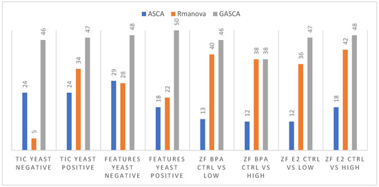 The following supporting information can be downloaded at: www.mdpi.com/article/10.3390/molecules27103304/s1; Table S1. Comparison of profiles obtained for variable selection. Values are the correlation coefficient of the absolute values of the vector profiles. Table S2. Logical relationships between the features detected by PLS-DA and FDR-corrected statistical tests, Selectivity ratio, ASCA, rMANOVA and GASCA. Shadowed columns represent common features between the two compared methods and Bold characters highlights those comparison with a number of coincidences higher than 80%. Table S3. ROI parameters selected for each dataset. Table S4. Parameters employed for MS-DIAL analysis. Table S5. Tentative identification of metabolites of endocrine disruption on zebrafish embryos and their significance with the different statistical methods. Figure S1. Zebrafish embryos exposed to a low-dose of estradiol. PCA analysis: PC1 vs. PC2 scores plot. Figure S2. Venn diagrams summarizing the relationships on the variables detected for each data set. (A) TICs matrix for yeast negative; (B) Features matrix for yeast negative; (C) Zebrafish embryos exposed to low-dose estradiol; and (D) Zebrafish embryos exposed to high-dose estradiol.