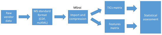 After this procedure, the matrices to be analyzed were built up (third step of Figure 5). On the one hand, the TIC chromatogram for every sample allowed to build up a matrix including all TIC information (size of this matrix was the number of samples by the number of points in the time axis, i.e., retention times). On the other hand, the MSROI procedure generated a features matrix containing the peak areas of the detected features (defined by a m/z value) for each sample [32].