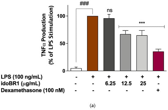 (a). Pre-treatment with idoBR1 (12.5 and 25 μg/mL) and dexamethasone (100 nM) reduced TNFα production in BV-2 microglia stimulated with LPS (100 ng/mL) for 24 h. TNFα production was evaluated in culture supernatants obtained from BV-2 microglia using mouse TNFα ELISA. All values are expressed as mean ± SEM for three independent experiments. Data were analyzed using one-way ANOVA for multiple comparisons with post hoc Student Newman–Keuls test. ns (not significant); *** p < 0.001 (treatment vs. LPS stimulation only); ### p < 0.001 (unstimulated cells vs. cells stimulated with LPS only). (b). Pre-treatment with idoBR1 (6.25, 12.5, and 25 μg/mL) and dexamethasone (100 nM) reduced IL-6 production in BV-2 microglia stimulated with LPS (100 ng/mL) for 24 h. IL-6 production was evaluated in culture supernatants obtained from BV2 microglia using mouse IL-6 ELISA. All values are expressed as mean ± SEM for three independent experiments. Data were analyzed using one-way ANOVA for multiple comparisons with post hoc Student Newman–Keuls test. ns (not significant); *** p < 0.001 (treatment vs. LPS stimulation only); ### p < 0.001 (unstimulated cells vs. cells stimulated with LPS only).