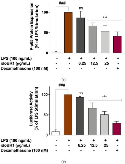 (a). idoBR1 (12.5 and 25 μg/mL) and dexamethasone (100 nM) suppress neuroinflammation by reducing LPS-induced increased phosphorylation of NF-κB p65 sub-unit in BV-2 microglia. Protein levels of phospho-NF-κB p65 (Ser536) sub-unit were determined in lysates obtained from BV-2 microglia stimulated with LPS for 60 min using ELISA. Values are expressed as mean ± SEM for three independent experiments. Data were analyzed using one-way ANOVA for multiple comparisons with post hoc Student Newman–Keuls test. ns (not significant); *** p < 0.001 (treatment vs. LPS stimulation only); ### p < 0.001 (unstimulated cells vs. cells stimulated with LPS only). (b). idoBR1 (12.5 and 25 μg/mL) and dexamethasone (100 nM) interfered with NF-κB activity through inhibition of NF-κB luciferase activity in BV-2 cells transfected with pGL4.32(luc2P/ NF-κB-RE/Hygro) vector and stimulated with LPS (100 ng/mL) for 6 h. Values are expressed as mean ± SEM for three independent experiments. Data were analyzed using one-way ANOVA for multiple comparisons with post-hoc Student Newman–Keuls test. ns (not significant); *** p < 0.001 (treatment vs. LPS stimulation only); ### p < 0.001 (unstimulated cells vs. cells stimulated with LPS only). (c) LPS-induced increased DNA binding by NF-κB was reduced by idoBR1 (12.5 and 25 μg/mL) and dexamethasone (100 nM). Nuclear extracts from BV-2 cells stimulated with LPS (100 ng/mL) for 60 min were investigated for binding to NF-κB consensus site (5′-GGGACTTTCC-3′). Values are expressed as mean ± SEM for three independent experiments. Data were analyzed using one-way ANOVA for multiple comparisons with post hoc Student Newman–Keuls test. ns (not significant); *** p < 0.001 (treatment vs. LPS stimulation only); ### p < 0.001 (unstimulated cells vs. cells stimulated with LPS only).