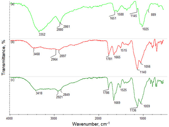 Chitosan owes its unique properties mainly to the NH2 groups of its polymeric chain. Figure 1 presents FT-IR analysis of the pristine polymer (a), Ch dissolved in TFA/DCM 7:3 (b), and Ch dissolved in TFA/DCM 9:1 (c). The spectrum of the native chitosan shows bands that are typical for free hydroxyl groups (3352 cm−1), aliphatic -CH2- and -CH3 moieties (2880 and 2861 cm−1), and amide bonds present in acetylated units (1651 cm−1). Additionally, bands coming from free NH2 are visible at 1588 and 1145 cm−1. Finally, there are bands at 1025 and 889 cm−1, typical for glycosidic bonds and glucopyranose rings. Figure 1b,c present the spectrum of chitosan after dissolving in TFA/DCM in different ratios (7:3; 9:1). The figure shows that there are some visible changes compared to the untreated Ch. There is a new band at 1781 cm−1, characteristic for free carboxyl and CF3 groups coming from trifluoroacetic acid. Noteworthy bands corresponding to amino groups are shifted to lower wave numbers (1515 and 1140 cm−1 for sample 1; 1525 and 1136 cm−1 for sample 2), which is typical for NH3+. Additionally, an increase in the intensity of the amide bonds can be noticed at 1665 cm−1 for sample 1 and at 1669 cm−1 for sample 2, which is a consequence of a chemical reaction between free carboxyl groups of trifluoracetic acid and free amino groups of chitosan. The change is especially significant in the case of TFA/DCM 9:1 application during Ch dissolution, due to the higher acid content. Bands corresponding to free -OH (3468 cm−1—sample 1; 3418 cm−1—sample 2), aliphatic groups (2964 and 2897 cm−1—sample 1; 2921 and 2849 cm−1—sample 2), and glycosidic bonds (1056 cm−1—sample 1; 1059 cm−1—sample 2) are visible as in the case of pristine chitosan.