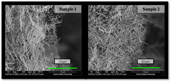 The choice of co-solvent is very critical for chitosan electrospinning to lower the surface tension of the solution and create a stable jet stream during the electrospinning procedure [29]. Fine, cylindrical, continuous, and randomly oriented Ch nanofibers were successfully prepared due to the high volatility of TFA and the possibility of blocking the positive charges of the amino groups on Ch. Such electrospun nanofibrous membranes were multilayered, porous, flexible, and permeable to liquid films with a high surface area. Their structure was determined by the cross-section method using a scanning electron microscope (Figure 2). SEM microphotographs also showed smooth fibers with diameters in the nano-range in both variants of membranes. However, the morphology of the deposited film depended on the TFA/DCM concentration in the solution. Although both sample 1 and sample 2 were fabricated under the same electrospinning conditions, their fiber diameter was 0.18 ± 0.009 and 0.2 ± 0.010 μm, respectively, and consequently deposited orientation significantly affected membrane porosity—‘porous area fraction’ (Figure 3) [30].