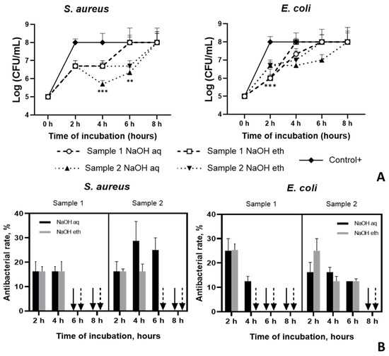 The reduction rate (R) of the total quantity of bacteria we calculated using the following Equation (1):