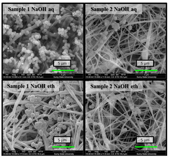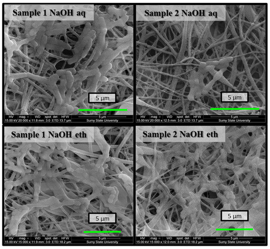 Scanning electron micrographs with ‘porous area fraction’ of sample 1 (Ch-TFA:DCM 7:3) and sample 2 (Ch-TFA:DCM 9:1) electrospun membranes after NaOH aqueous and NaOH ethanol treatment.