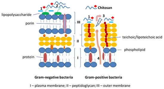 Schematic representation of chitosan mode of action on Gram-negative and Gram-positive bacteria cell wall. 1. Electrostatic adsorption and interaction between chitosan with cationic ions and bacteria cell wall. 2. The collapse of the outer membrane of the cell wall and blocking of nutrient flow. 3. Modification of cell permeability and disruption of the plasma membrane. 4. Osmotic damage and release of intracellular components.