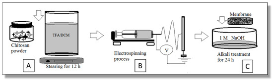 Schematics of sample preparation: (A) chitosan solution preparation; (B) electrospinning process; (C) alkali treatment of chitosan membrane.