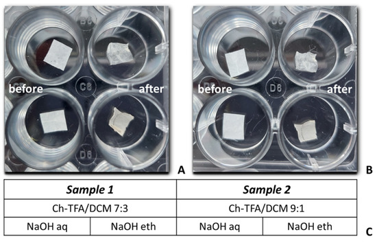 Macroscopic image of chitosan membranes—sample 1 (A) and sample 2; (B) before and after 24 h alkali treatment with 1 M NaOH aqueous (upper row) and 1 M NaOH ethanol solutions (lower row). Types of samples prepared for research (C).