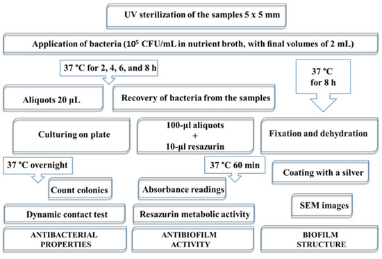 The antibacterial properties were studied using a Gram-positive bacterium, namely, Staphylococcus aureus (S. aureus, B 918) and a Gram-negative bacterium, Escherichia coli (E. coli, B 926), obtained from the Bacteria Collection of Sumy State University by the National Collection of Microorganisms (Institute of Microbiology and Virology NASU, Kyiv, Ukraine). Cultures were incubated at 37 °C for 24 h. Then, bacterial suspensions were prepared and adjusted to an initial concentration of 105 colony-forming units per milliliter (CFU/mL) with a liquid microbial growth medium. The antimicrobial performance of the Ch fibers was evaluated according to Figure 11. The dynamic contact test was applied for antibacterial efficiency and, consequently, bacterial reduction in vitro estimation. Ability to inhibit biofilm formation was assessed with a resazurin-based assay grounded on biological peculiarities of bacterial community behavior. SEM of the samples after 8 h incubation in bacterial suspension was carried out for biofilm bacterial structure assessment. Samples of 0.25 cm2 were placed in the laminar box (Porsa, Ukraine), and UV-light radiation at 254 nm was applied for 30 min on each side. The independent tests for samples and controls were completed in triplicates for both bacterial species. The experiments were carried out at a constant ambient temperature, humidity, and light.