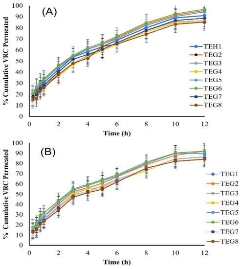 In vitro release data showed that TEG8, TEG7, TEG4, and TEG3 formulations containing 3% lipoid SPC-3 permeated less via cellophane membrane as compared to TEG1, TEG2, TEG5, and TEG6 formulations. TEG formulations were released up to 92% in 12 h. The ex vivo % VRC that was permeated was also determined as shown by the graph in Figure 5 with a drug release up to 92% in 12 h. The permeation flux (Jmax) at 12 h and the enhancement ratio (ER) of pure VRC and TEG6 formulation are shown in Table 3.
