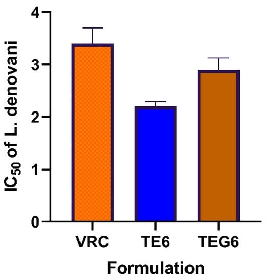 Antileishmanial activity against L. donovani is represented in graphical form in Figure 6. The results showed there was a significant increase in the activity of the transethosomal formulation as compared to pure VRC. The activity of VRC loaded TELs formulations may be attributed to their ability to interact with the outer coat of the parasite and deliver the drug.